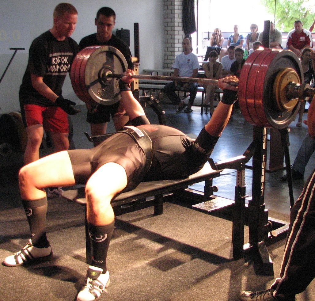 Например, Райан Кеннелли, рекордсмен по жиму лёжа в экипировочном дивизионе, облачившись в специальную майку, показал результат 487 кг., а без экипировки его достижения были куда «скромнее» – 294 кг. Владимир Блинков, в специальной майке, брифсах и бинтах, приседал с весом 502 кг.