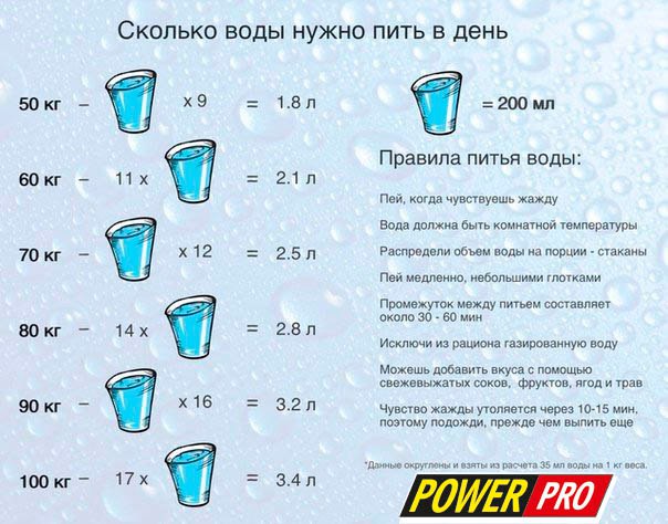 Подсчитать, сколько пить воды в день по весу, можно из инфографики ниже.