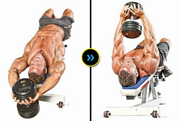 При желании прокачать трицепс жимами, попробуй предварительно утомить более крупные грудные гантельными сведениями — выполни 3 подхода по 15 повторений, выдерживая паузу между ними в 90 секунд. Теперь смело можешь переключать внимание на руки!