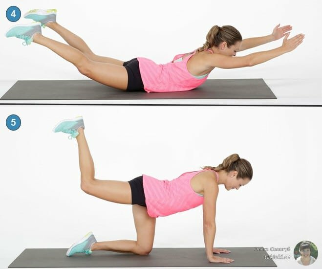 9. Примите положение «упор лежа». Таз не должен подниматься вверх, спина остается прямой. Поднимайте по очереди ноги вверх, не прогибаясь в пояснице, по 20-30 раз.
