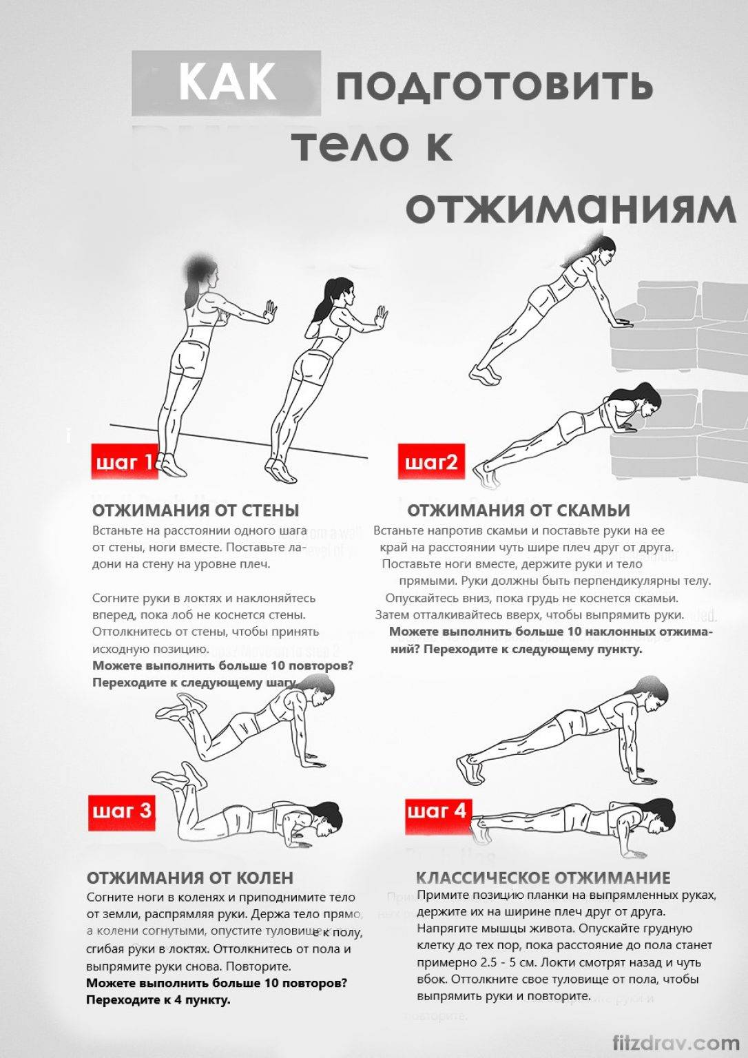 Запястья. У вас могут заболеть кисти и запястья, если раньше вы нечасто делали отжимания. Это нормально и связано с тугоподвижностью этих суставов. Рекомендуем подобрать наиболее комфортное для себя положение ладоней на полу и делать отжимания именно так. Постепенно ваши кисти и запястья привыкнут к нагрузке и укрепятся. Как вариант, можно делать отжимания на кулаках или на упорах для отжиманий, параллельно улучшая гибкость запястий соответствующими упражнениями. Хорошая подборка упражнений на гибкость есть на нашем YouTube канале — https://www.youtube.com/watch?v=s3fAukQiISM