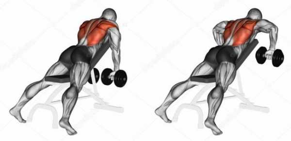 Для задней дельты подъем локтей лёжа на наклонной скамье, такое же самое эффективное упражнение в тренажерном зале, как для центральной дельты подъемы локтей с грифом стоя.