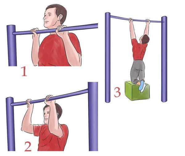 - Зафиксировать руки любым хватом, а затем опору в виде табурета отодвинуть, т.е. необходимо повиснуть за счет хвата.